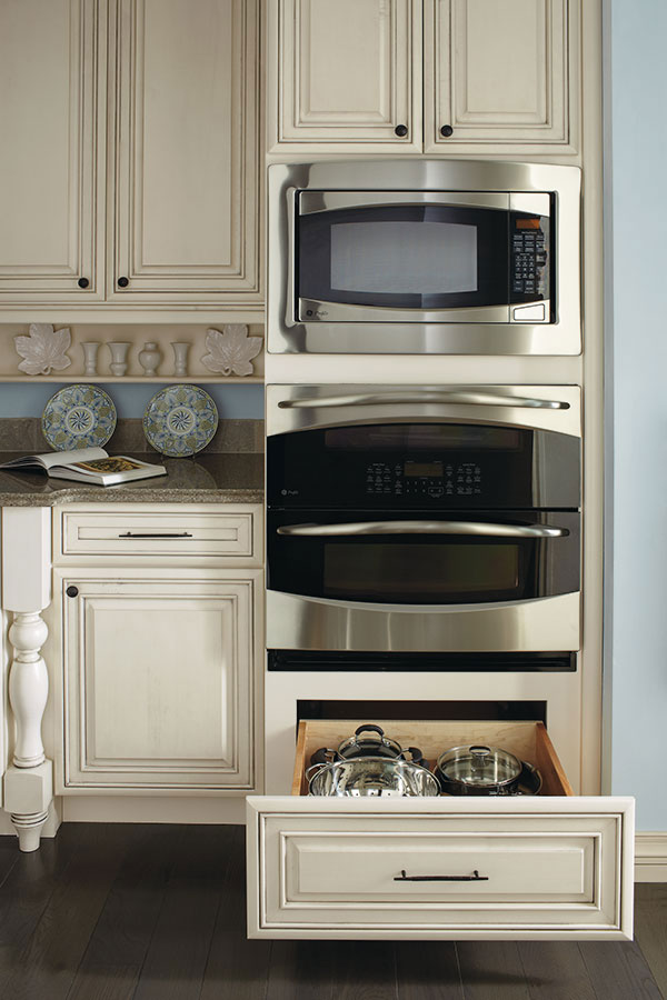 Having a deep drawer in the bottom of a double oven cabinet is perfect for storing baking items, such as Bundt and angel food cake pans or anything that needs a little extra height.